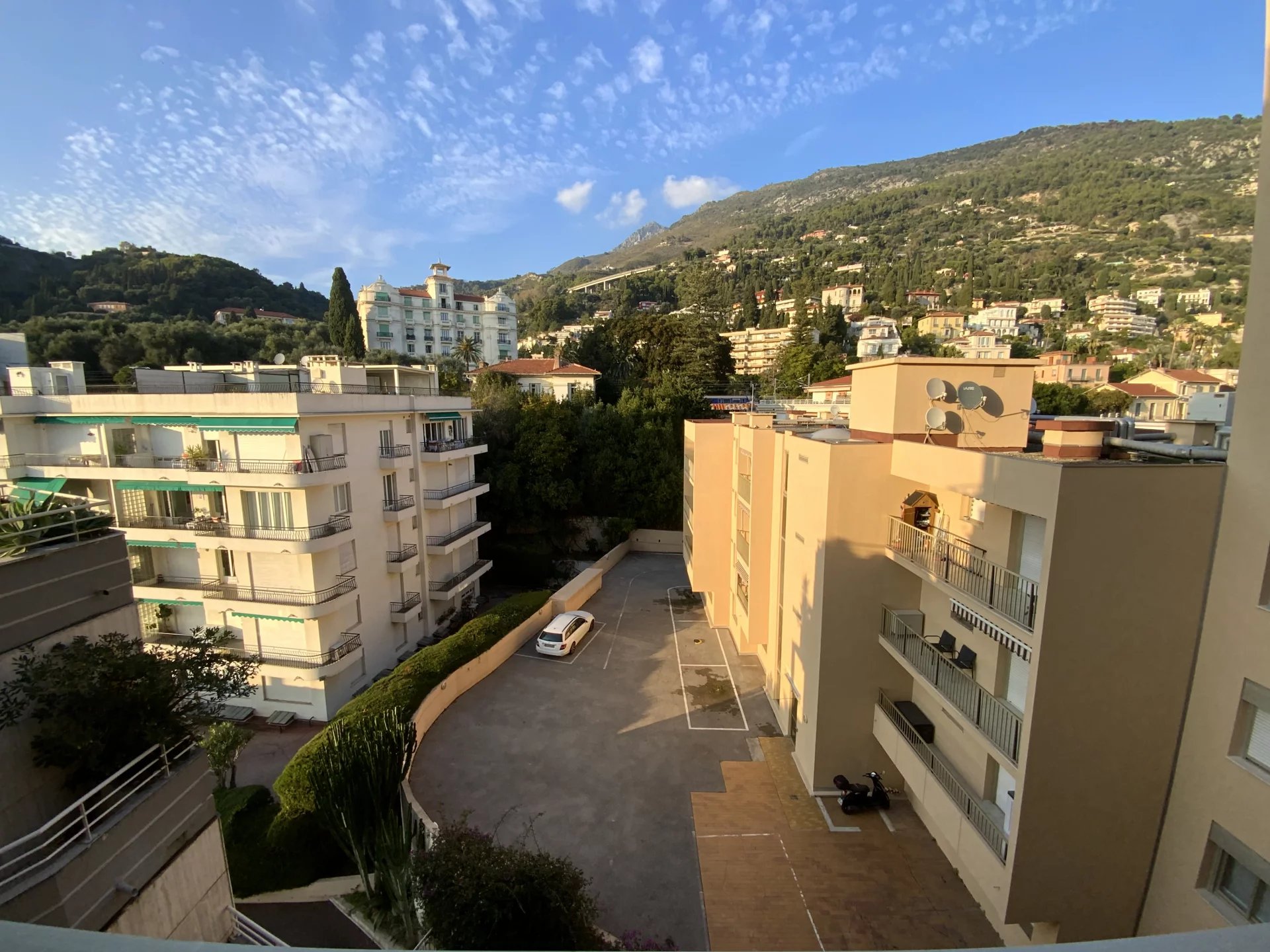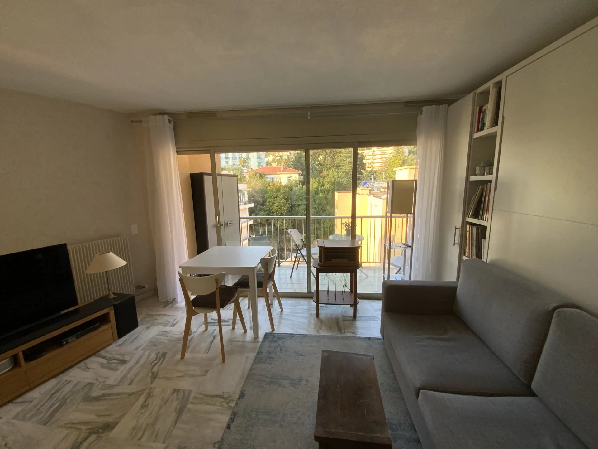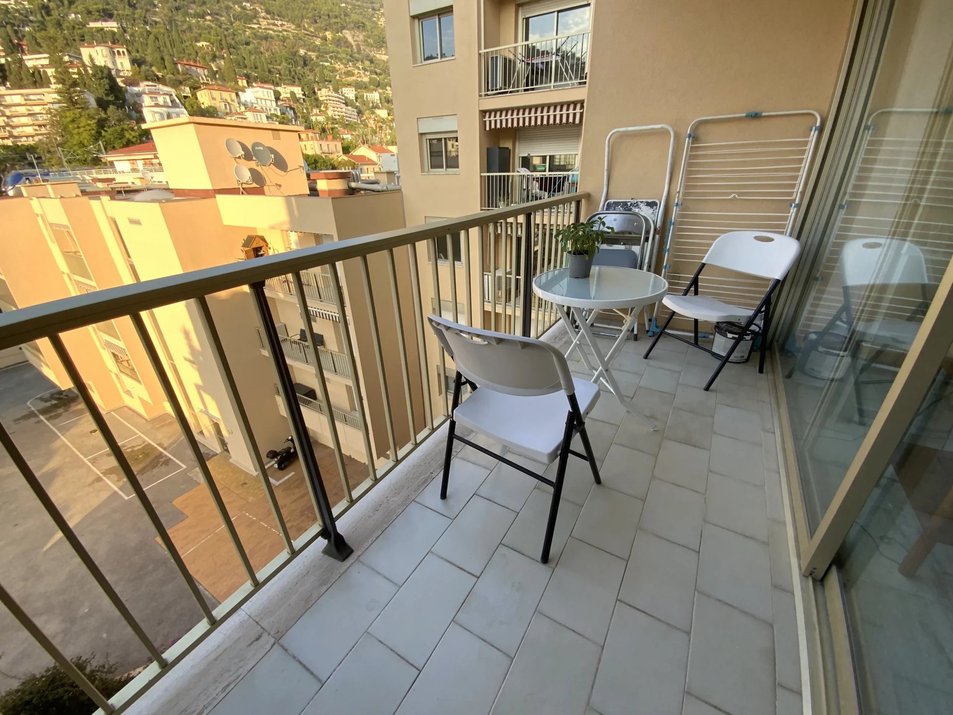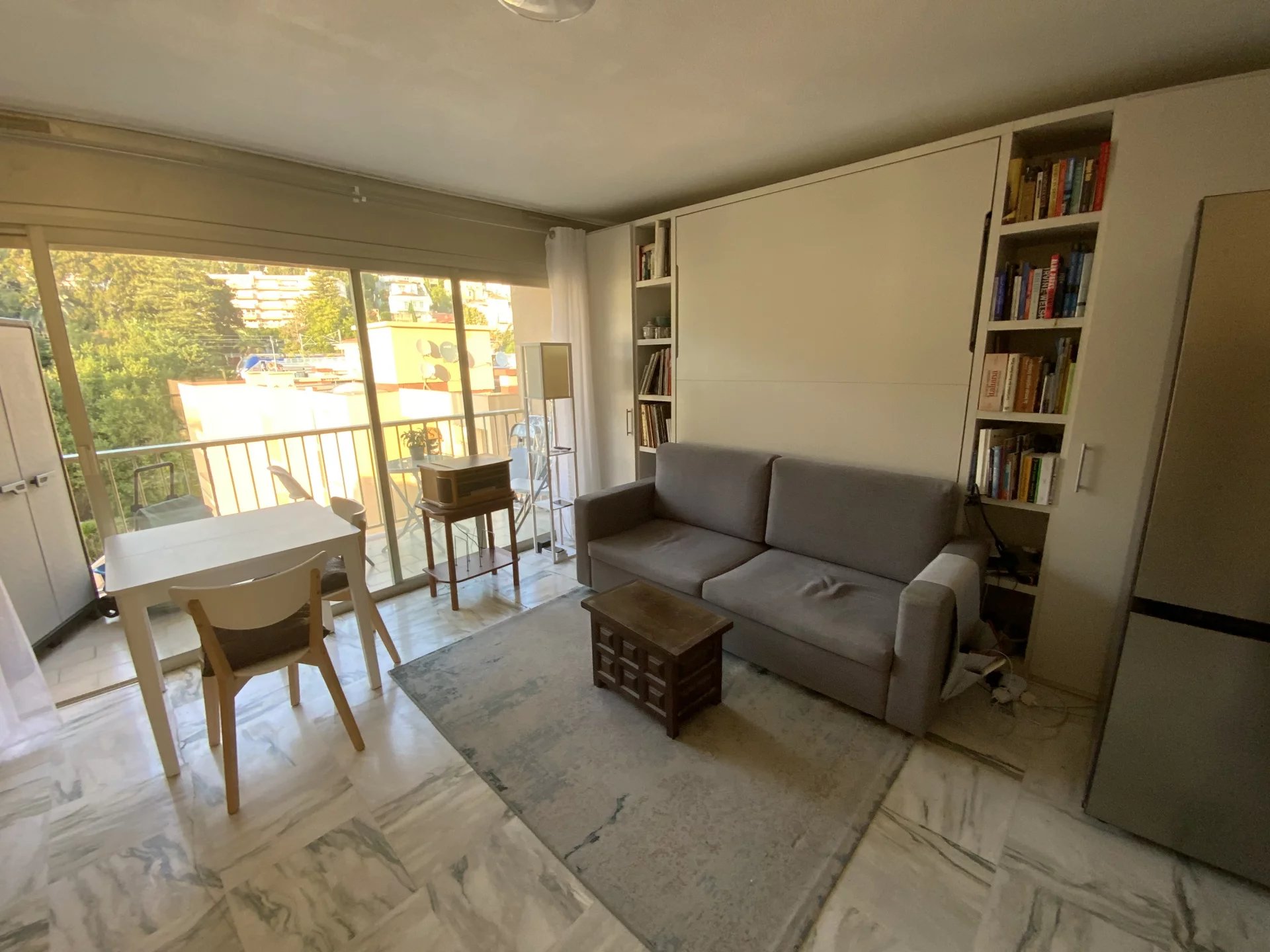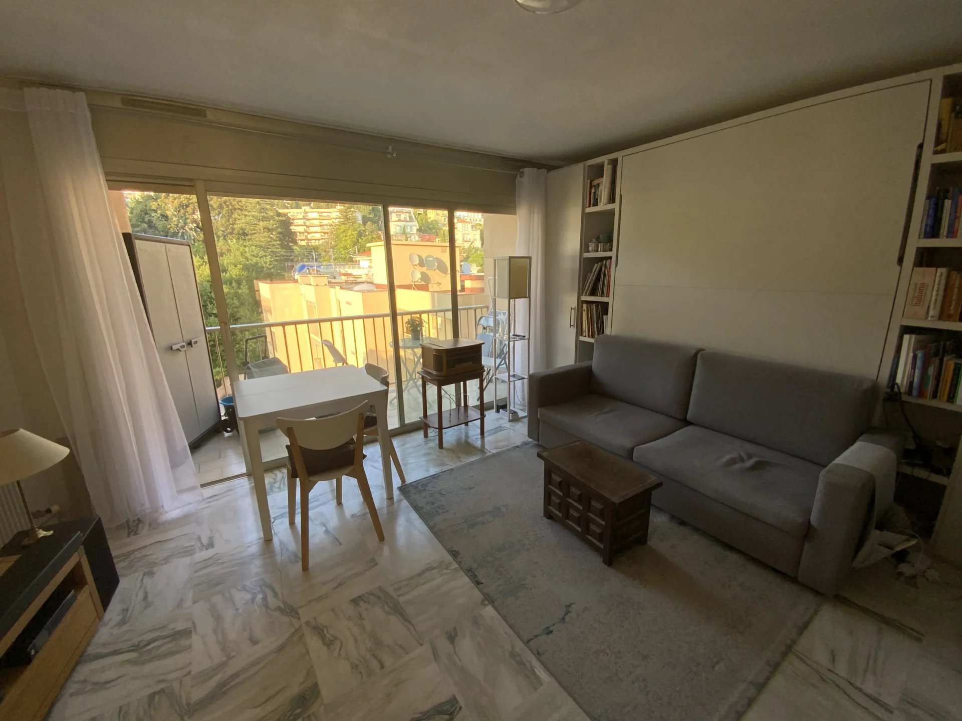 EXCLUSIVITE MENTON GARAVAN, dans une residence de standing en bord de mer, beau studio de 30,47 m2 loi carrez, au cinquième étage, terrasse. Vendu avec meuble/lit très design. Cave. Inclus dans les charges le chauffage, eau froide et chaude.